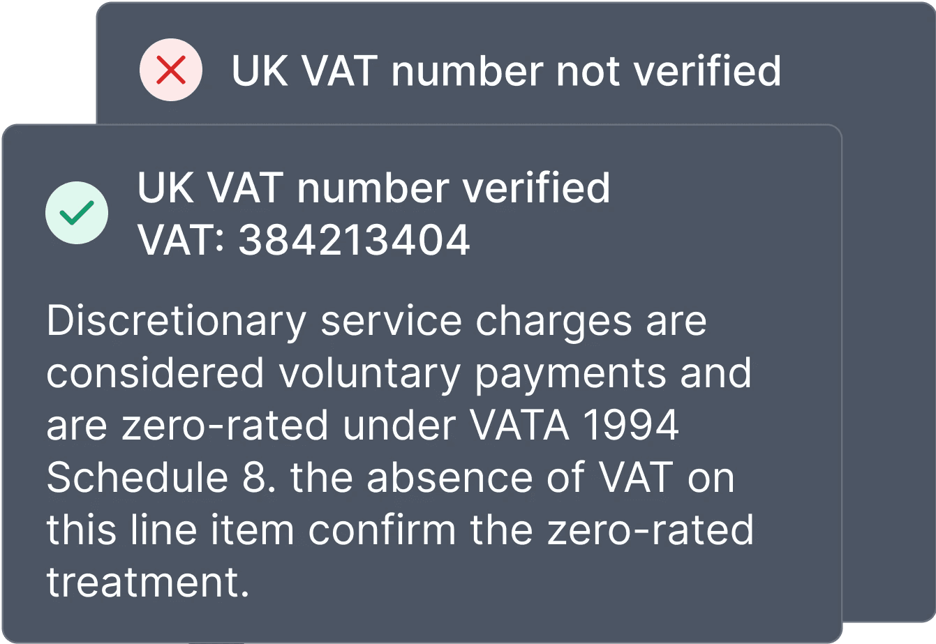 Trained on UK VAT legislation to identify valid VAT invoices, verify VAT numbers and auto-split lines based on different VAT treatments.