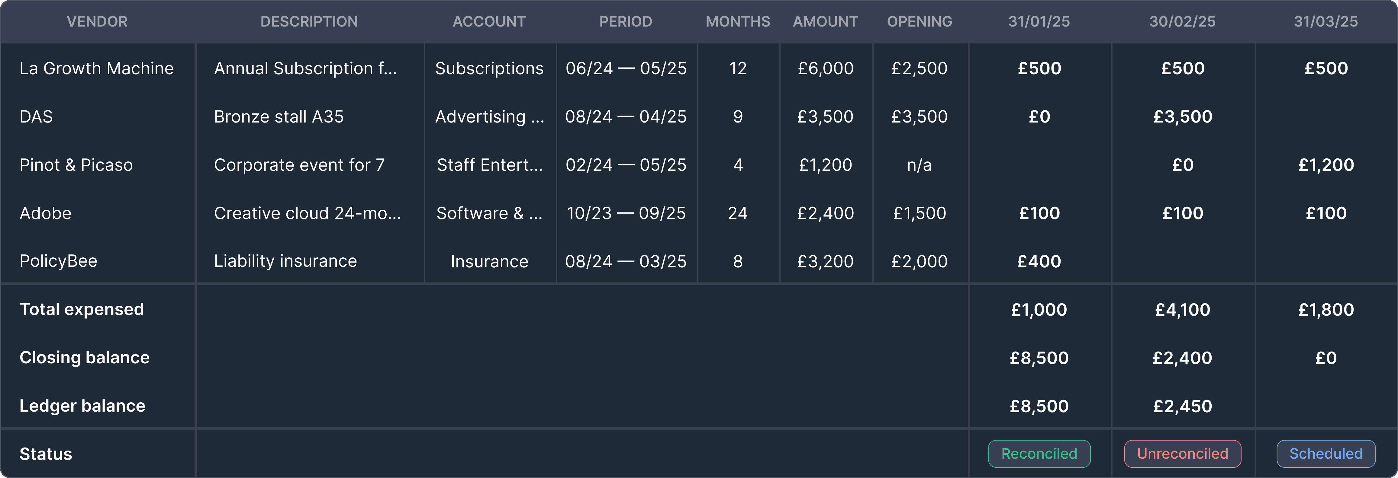 Automatically detects prepayments, builds schedules, posts journals, and reconciles everything–ready to CSV export into your management pack.