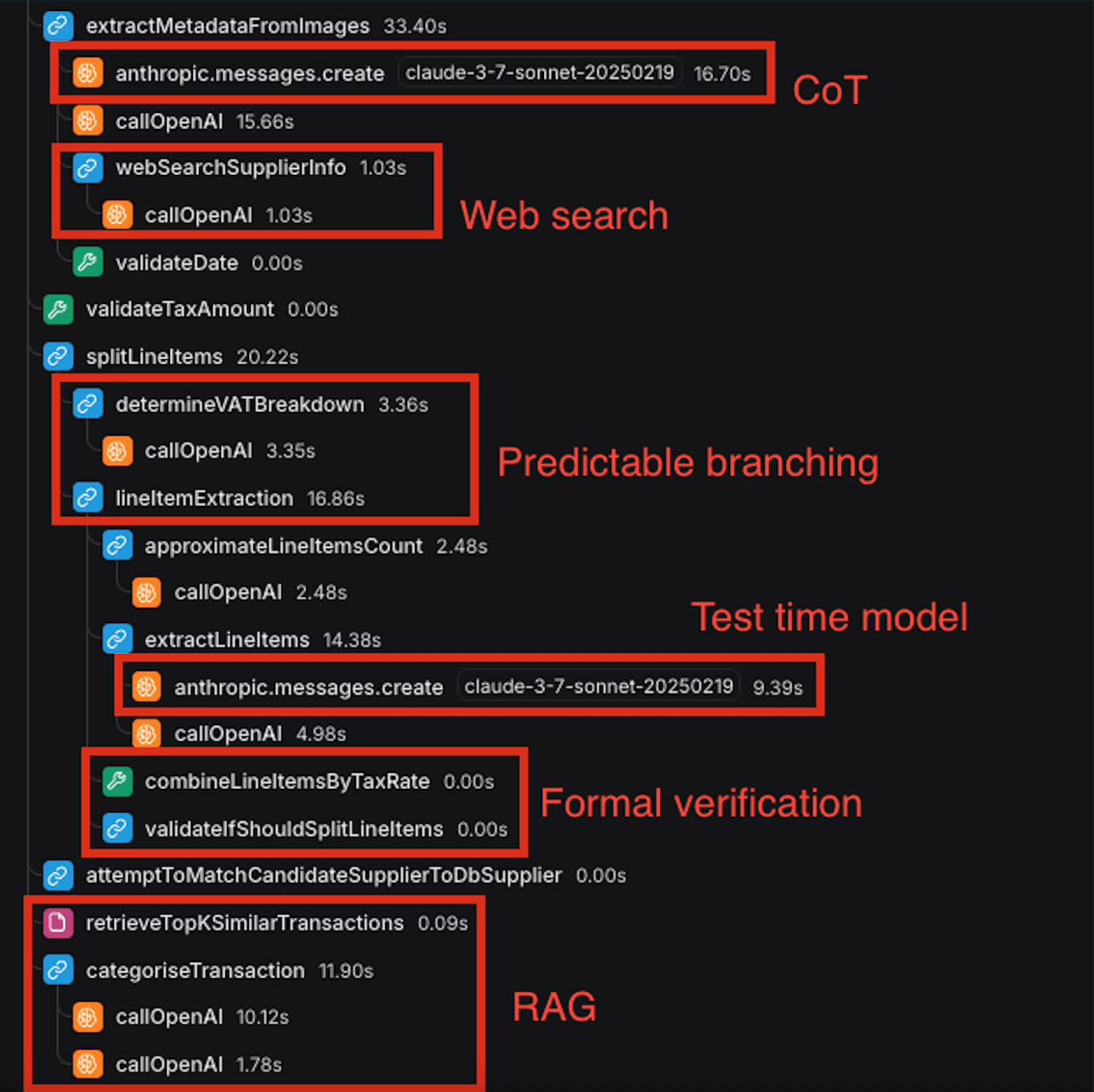 A common workflow for users of Briefcase is to upload their invoices into the system. Briefcase will then perform a bookkeeping workflow on each invoice which consists of multiple reasoning tasks such as extraction, line item split, categorisation and VAT rate assignment. Here's a snippet of our AI agent: