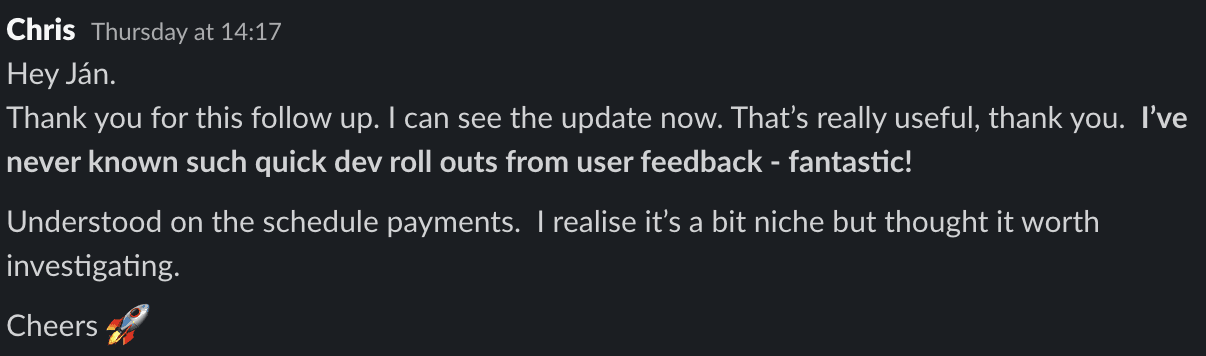 Recognising work both internally (of course we have a #wins channel 💪) and externally (we have a direct communication channel with every customer which we also use to send and receive love ❤️)